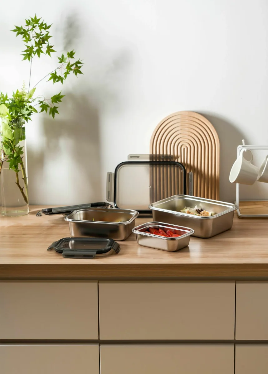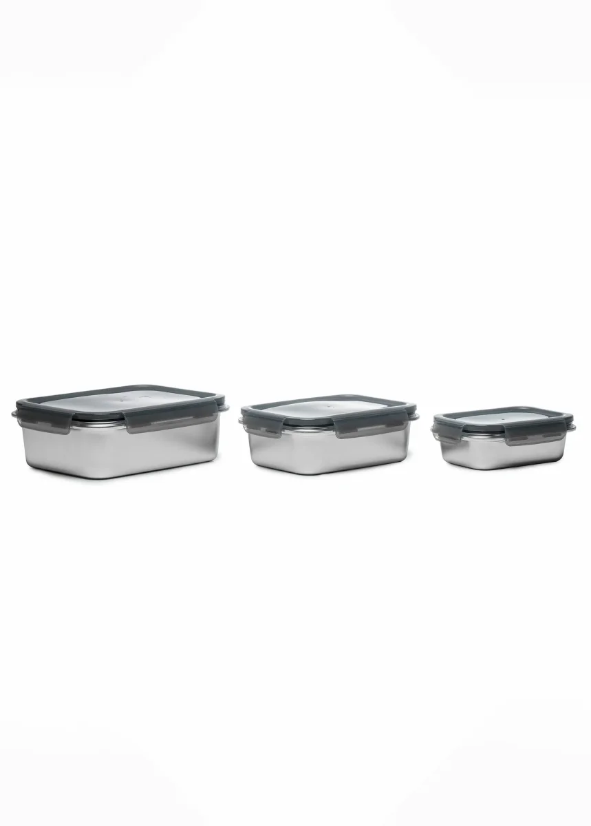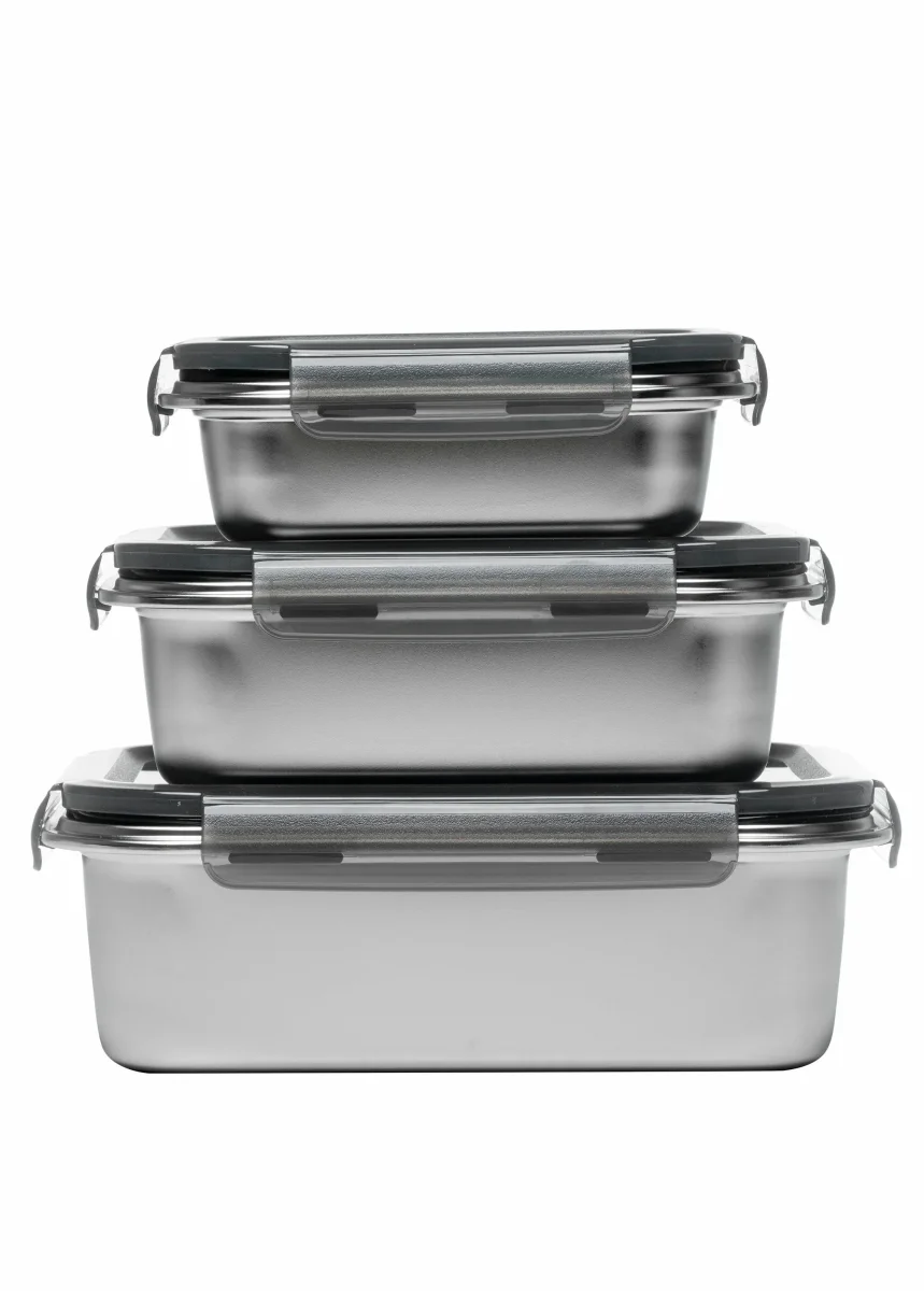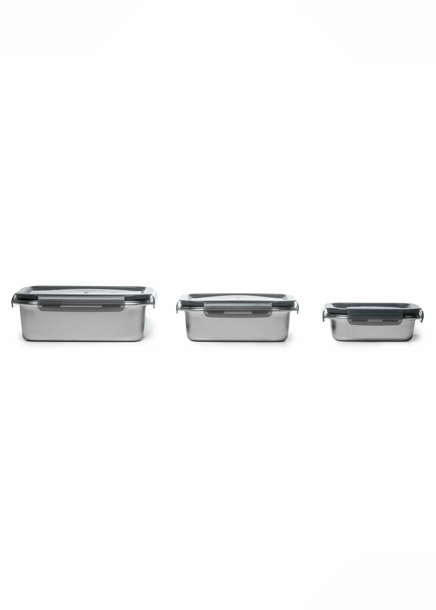 Set comprenant : 1 Boîte rectangulaire 17 x 13 x 5,8 cm, capacité : 650 ml + 1 Boîte rectangulaire 21 x 16 x 7,9 cm, capacité : 1,3 L + 1 Boîte rectangulaire 24 x 19 x 8,3 cm, capacité : 2, 25 L – Fabriqué en acier inoxydable – Sans BPA – Leurs couvercles hermétiques à clips évitent les fuites et protègent le contenu du givre, rendant ces récipients parfaits pour le transport ou la conservation des aliments.
